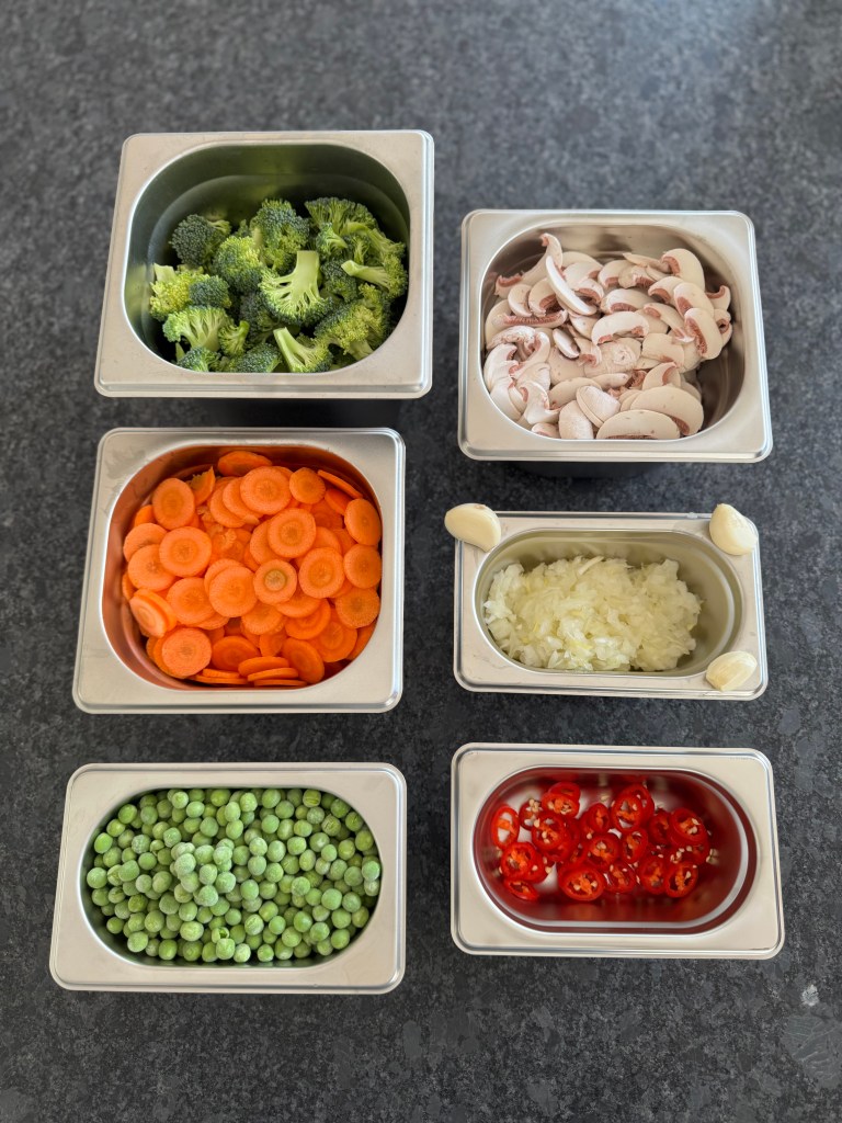 Karotten schälen und in dünne Scheiben schneiden. Brokkoli waschen und in Röschen schneiden. Champignons putzen und in Scheiben schneiden. Knoblauch und Zwiebeln abziehen und kleinhacken. Chilischote klein schneiden.